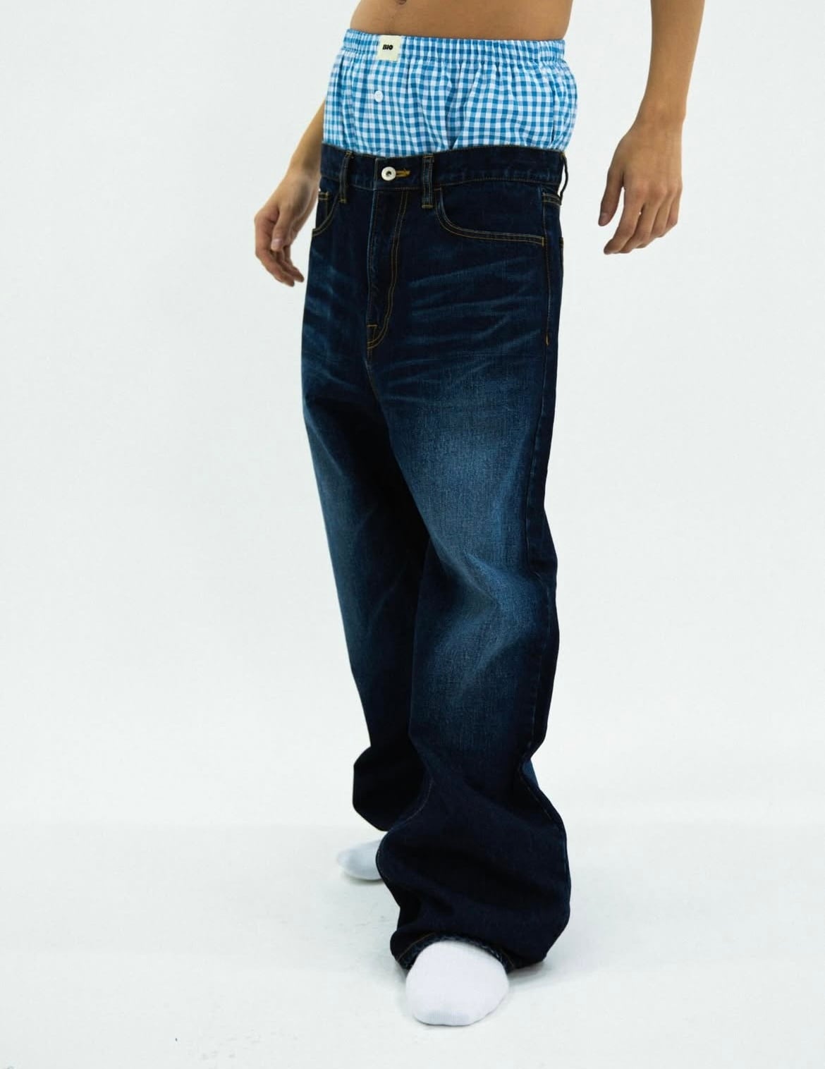 SERIES1で初登場し、定番化したアンダーウェアドッキングジーンズ。いつものウエスト位置で着用して頂くと腰履きしているようなルックスのワイドジーンズ。定番色のインディゴに加えて、ブラックにホワイトステッチからお選びください。