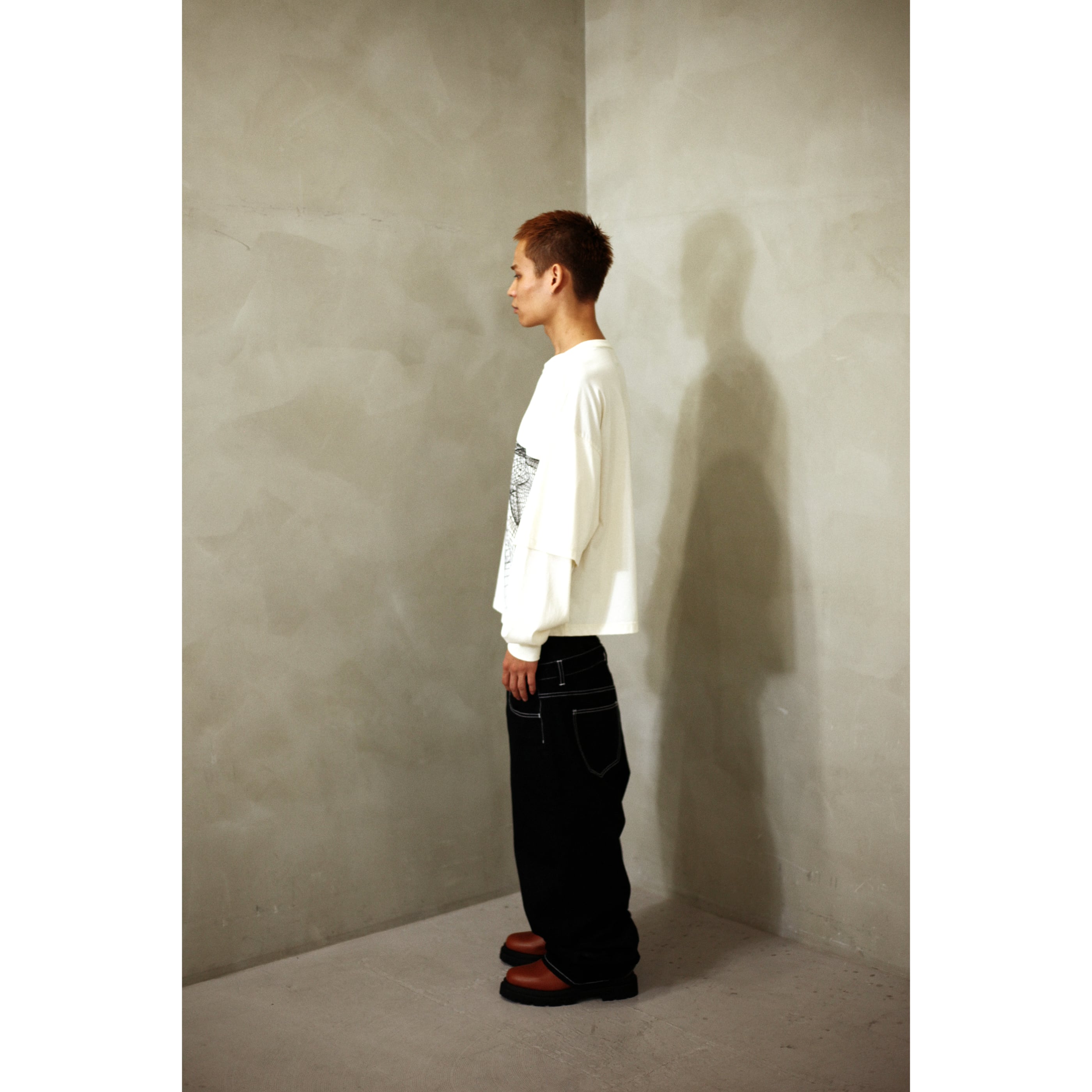 肩から裾まで縫い目を無視し大胆にプリントしたレイヤードロングスリーブTシャツ。