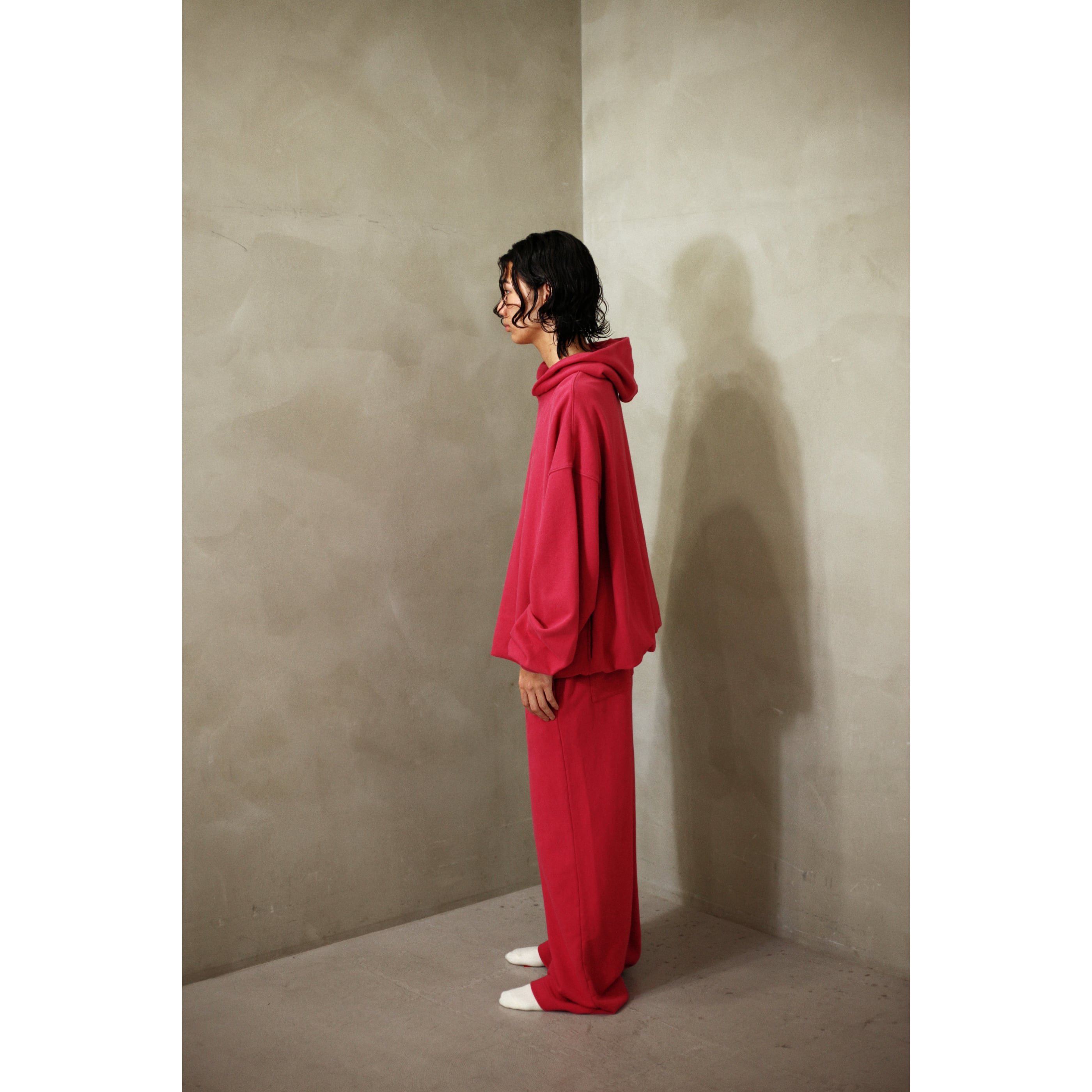 定番化したアンダーウェアドッキングジーンズがスウェットになってリリース。いつものウエスト位置で着用して頂くと腰履きしているようなルックスのワイドスウェットパンツ。色褪せた風合いに加工が施されています。