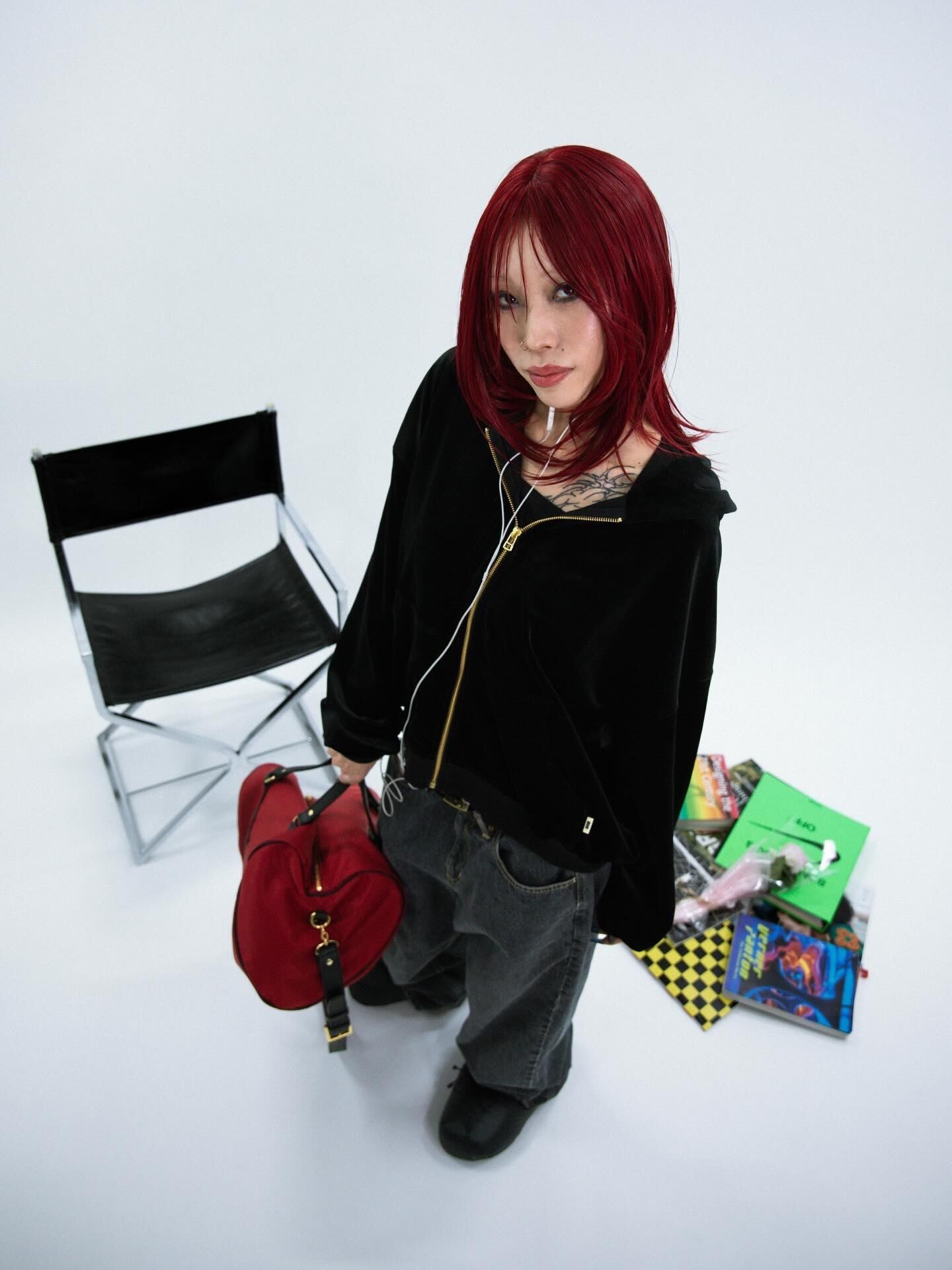 ジップカラーがゴールドになったベロア調のジップフーディー。