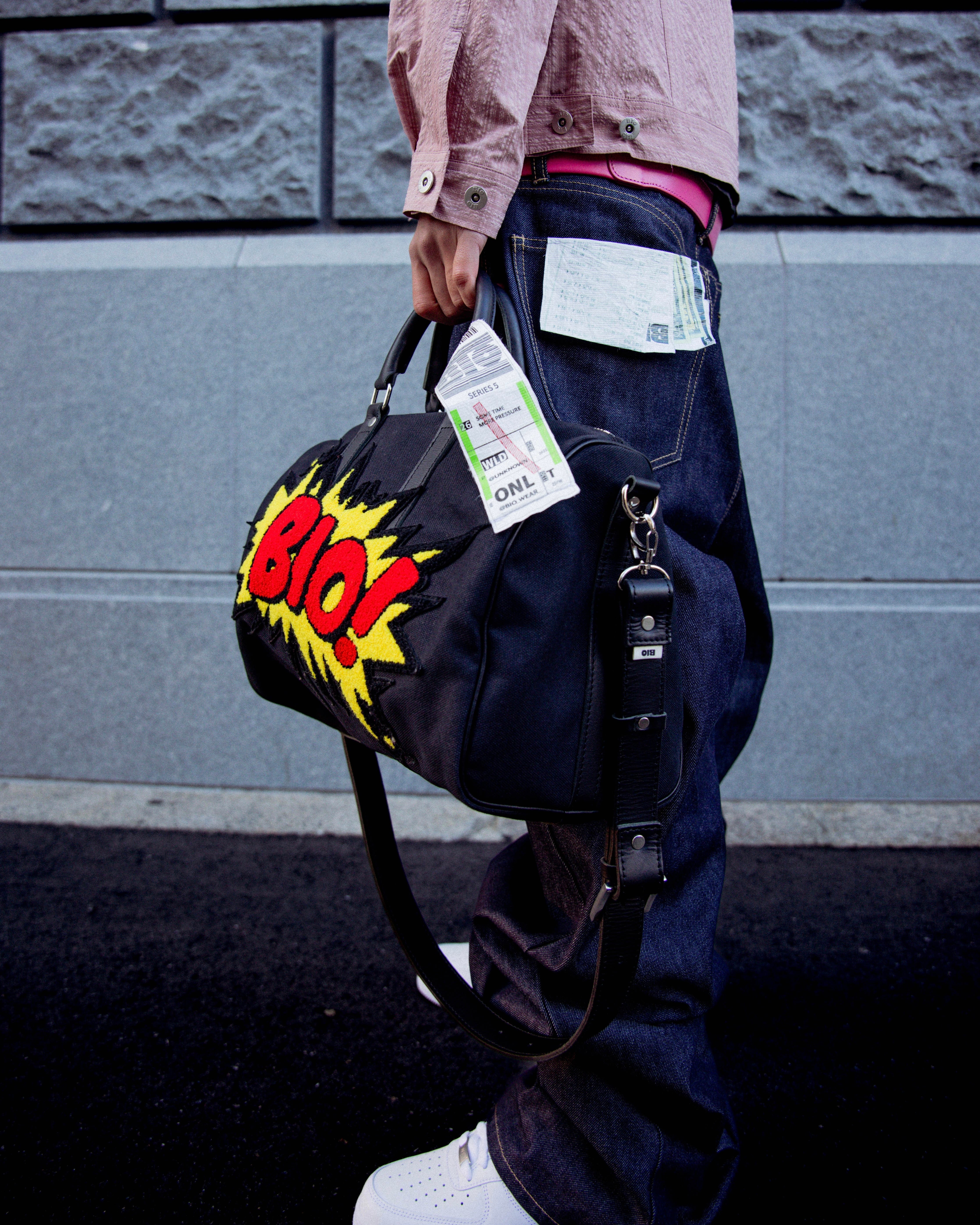 メインボディにキャンバス生地とベルトやハンドルにリアルレザーを使用したボストンバッグ。 シリーズ1からBIOのシグネチャーでもあるコミックモチーフのワッペンを大胆に貼り付けています。